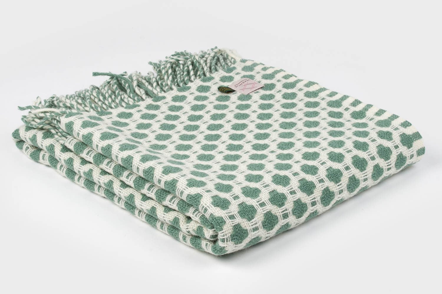 Zachte wollen plaid, geweven in een kruispunt patroon in de kleurenstelling groen met wit. De plaids zijn lekker warm en zacht, ze zijn wat grof geweven en vallen soepel. Past goed bij alle grijs tinten.