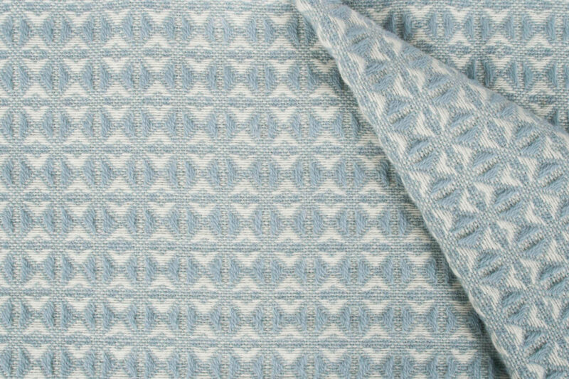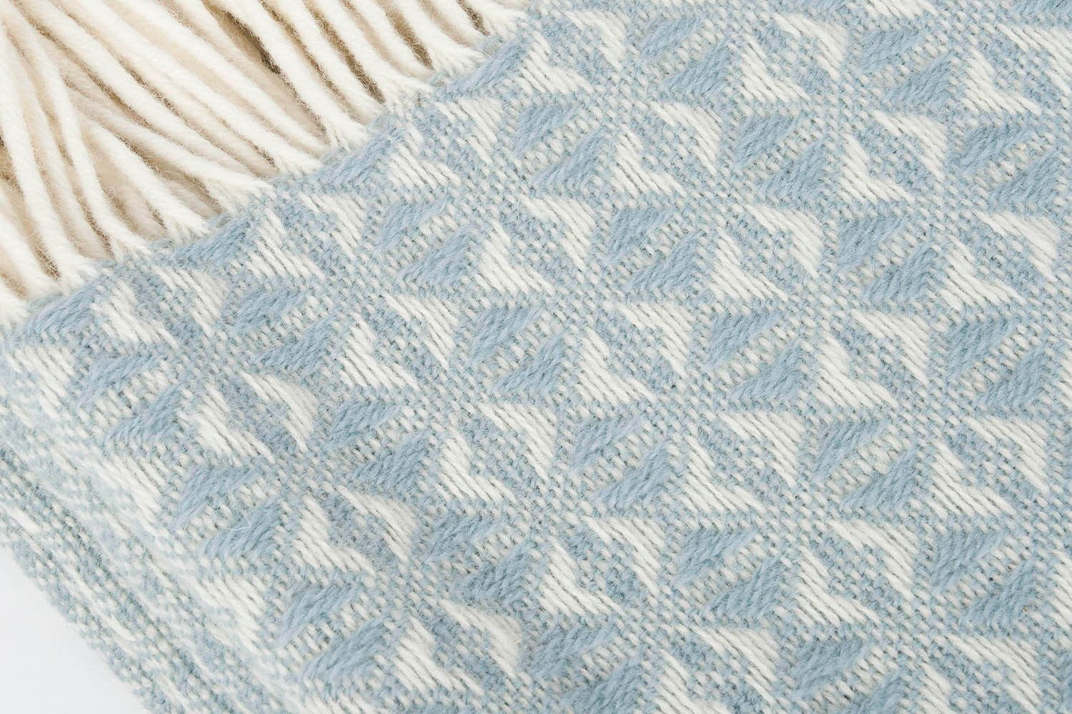 Mooie wollen plaid met een geometrisch geweven patroon, in de kleurstelling lichtblauw – wit. Het is een zachte, soepele plaid. Hij voelt wat zwaarder aan, maar is toch niet te dik. Een heerlijke deken voor op de bank.